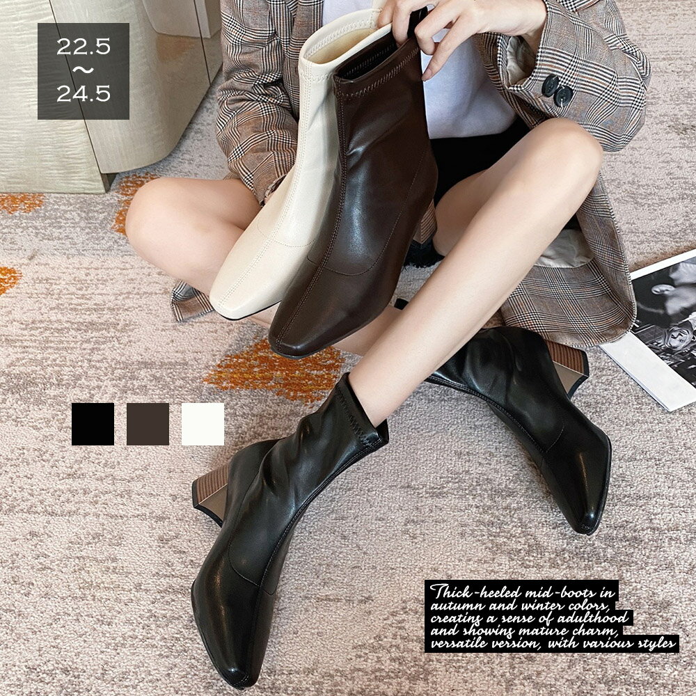 ブーツ レディース 秋冬 ソックスブーツ 太ヒール ショート丈 スクエアトゥ 合皮