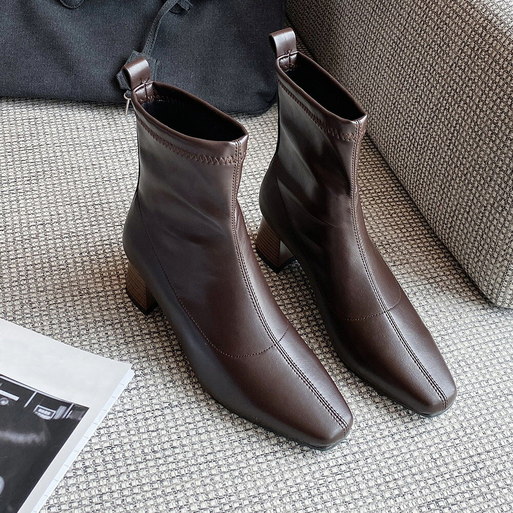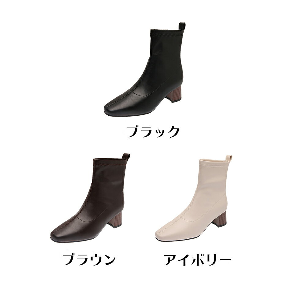ブーツ レディース 秋冬 ソックスブーツ 太ヒール ショート丈 スクエアトゥ 合皮